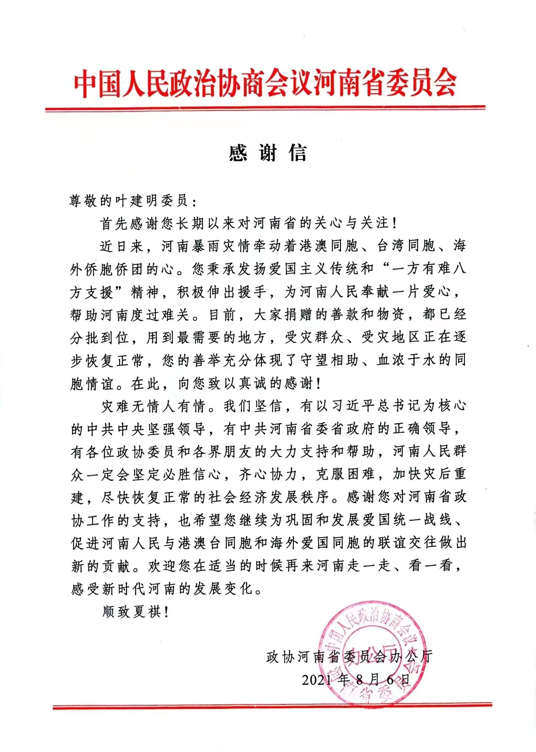 政協(xié)河南省委員會(huì)辦公廳向葉建明先生發(fā)來的感謝信