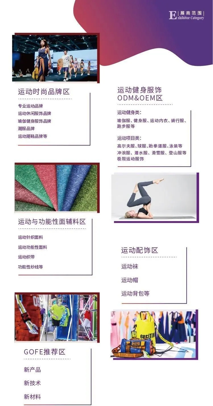 為了滿(mǎn)足運(yùn)動(dòng)消費(fèi)群體擴(kuò)容及消費(fèi)訴求升級(jí),GOFE 2023展示品類(lèi)細(xì)分為五大類(lèi),包括運(yùn)動(dòng)時(shí)尚品牌、運(yùn)動(dòng)健身、運(yùn)動(dòng)項(xiàng)目類(lèi)、運(yùn)動(dòng)配飾、運(yùn)動(dòng)與功能性面輔料,一站式為運(yùn)動(dòng)時(shí)尚行業(yè)專(zhuān)業(yè)人士展示新產(chǎn)品、提供新趨勢(shì)、發(fā)掘新商機(jī)。